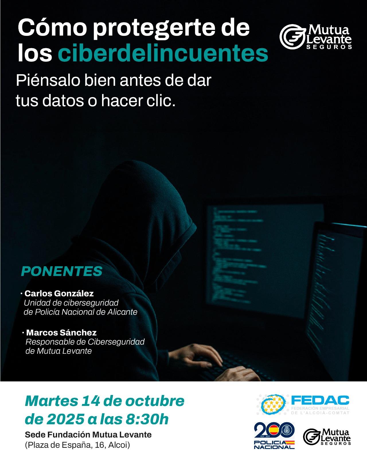 En un contexto donde la digitalización crece a gran velocidad y los ataques informáticos son cada vez más sofisticados, Mutua Levante, FEDAC y la Policía Nacional organizan una sesión práctica y gratuita sobre ciberseguridad dirigida a las empresas de Alcoy y su entorno.